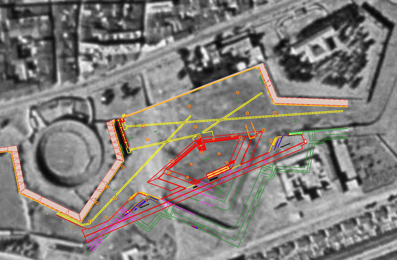 Dibujo de la cartografía militar de Badajoz de los años veinte del siglo XIX y de los hallazgos producidos en nuestro seguimiento, sobre la ortofotografía del vuelo norteamericano de 1956-1957.